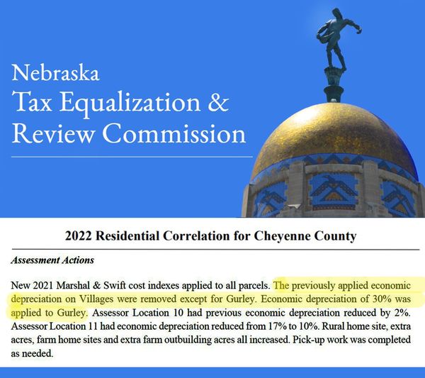 In the report, page 10 top paragraph it does indeed note that while most of the taxes in Cheyenne County went up the area of Gurley received a 30% discount. And it is true that our assessor lives in Gurley. This is not bashing. This is fact and corroborated by the TERC commission report. There may be a perfected good explanation for this, but we haven’t seen any as of yet, and we are continuing to look into this.