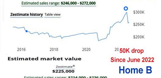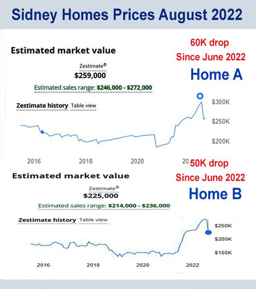 Here are two homes we looked at today on Zillow. Both in Sidney and both on the market at this time. These graphs are directly from Zillow which nationwide has a 90% accuracy rate. You can see in the last few months both homes have lost substantial amounts of value.