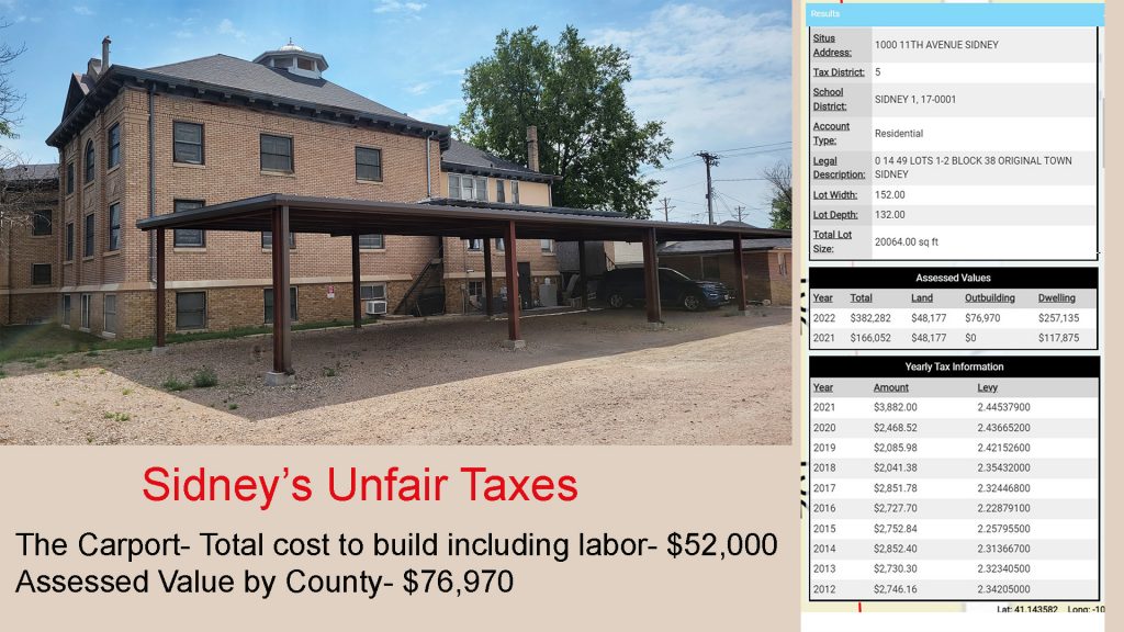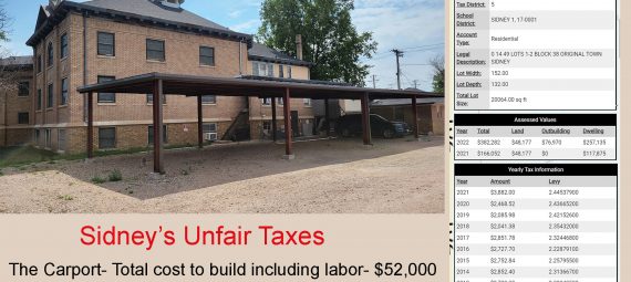 She told us at that time our new carport would be valued at “replacement” costs which were $52,000, which is the total cost to build it including labor from a local contractor. I said the national average for carport valuation in the USA is 80% of the cost. So we should be around $40,000. Nope, she got angry, and said she was not done. Now, we see. She valued a carport that took $52,000 to build with a permit she had in her office at $76,970. So the national average is 80% but in Sidney, if you complain it is 148%. WOW. And it looks like the carport ADDED even more value to our building because it more than doubled in value!!! WOW. Don’t build in Sidney!!!!